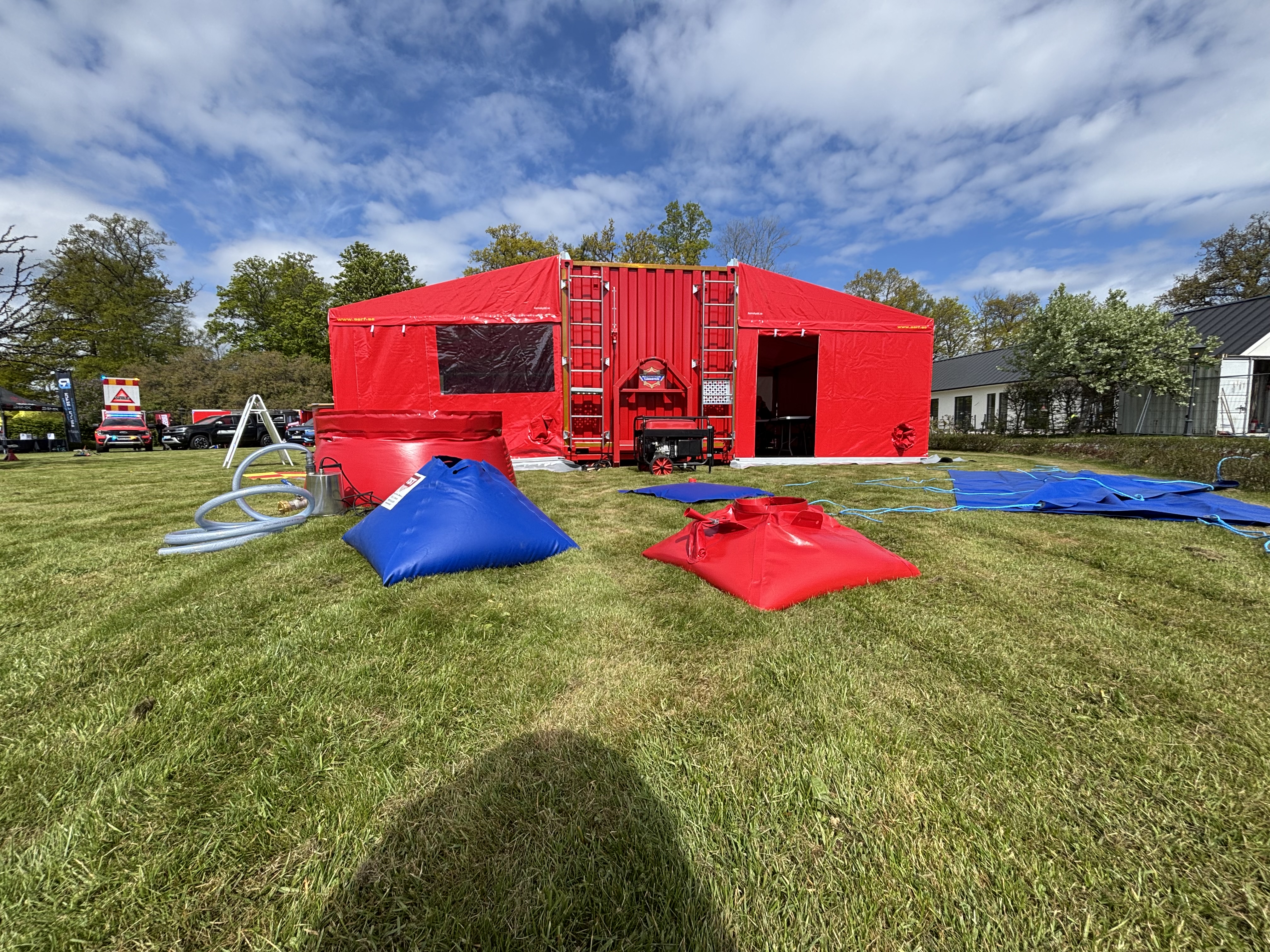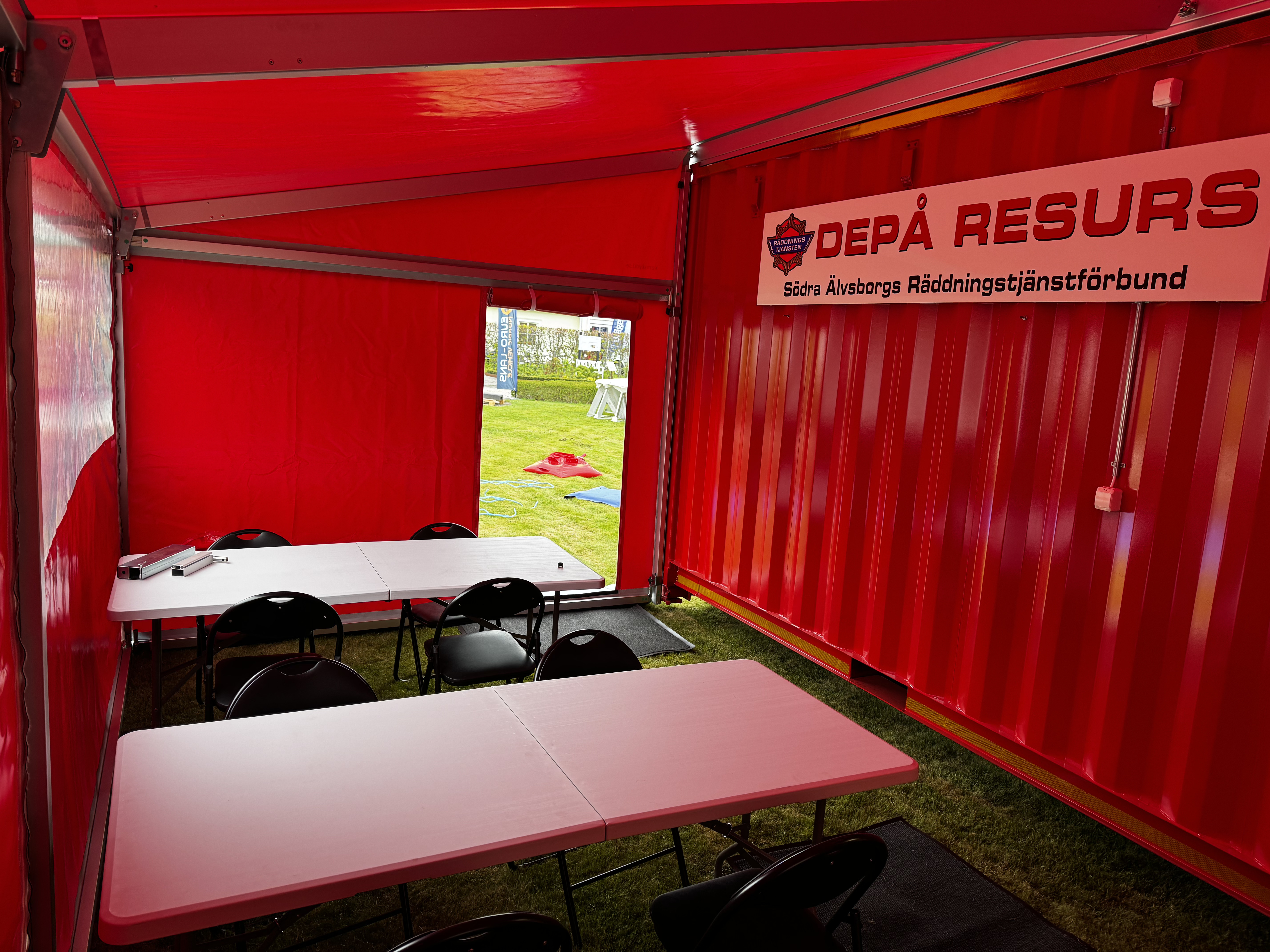 We have developed a tent for fire engines with a folding door together with the fire department. They have many female firefighters and this means that they can change in the tent without being seen. It also works as a rain and weather protection. Some fire engines also have a heat outlet in that cabinet so you can use it as a heating tent.