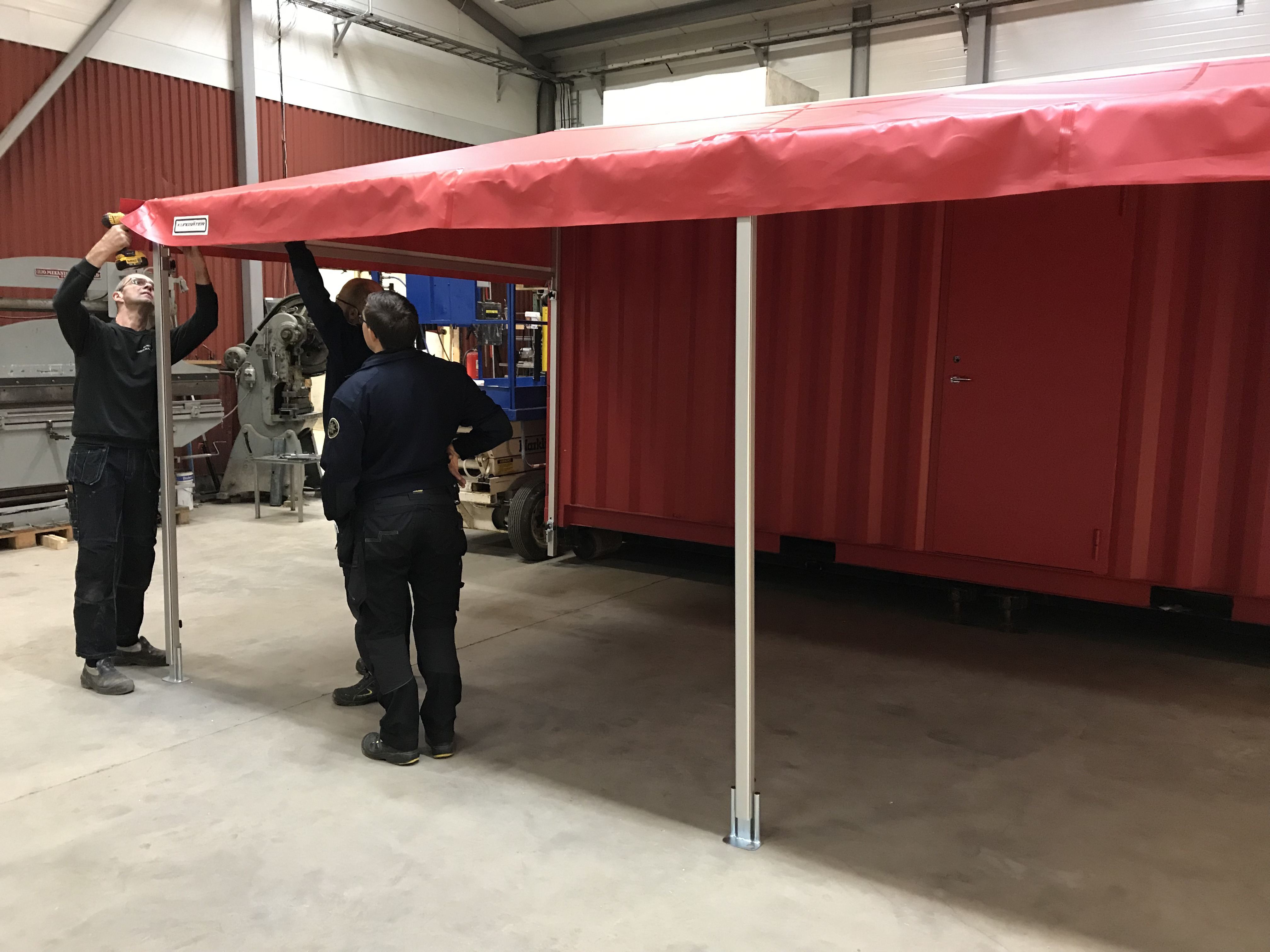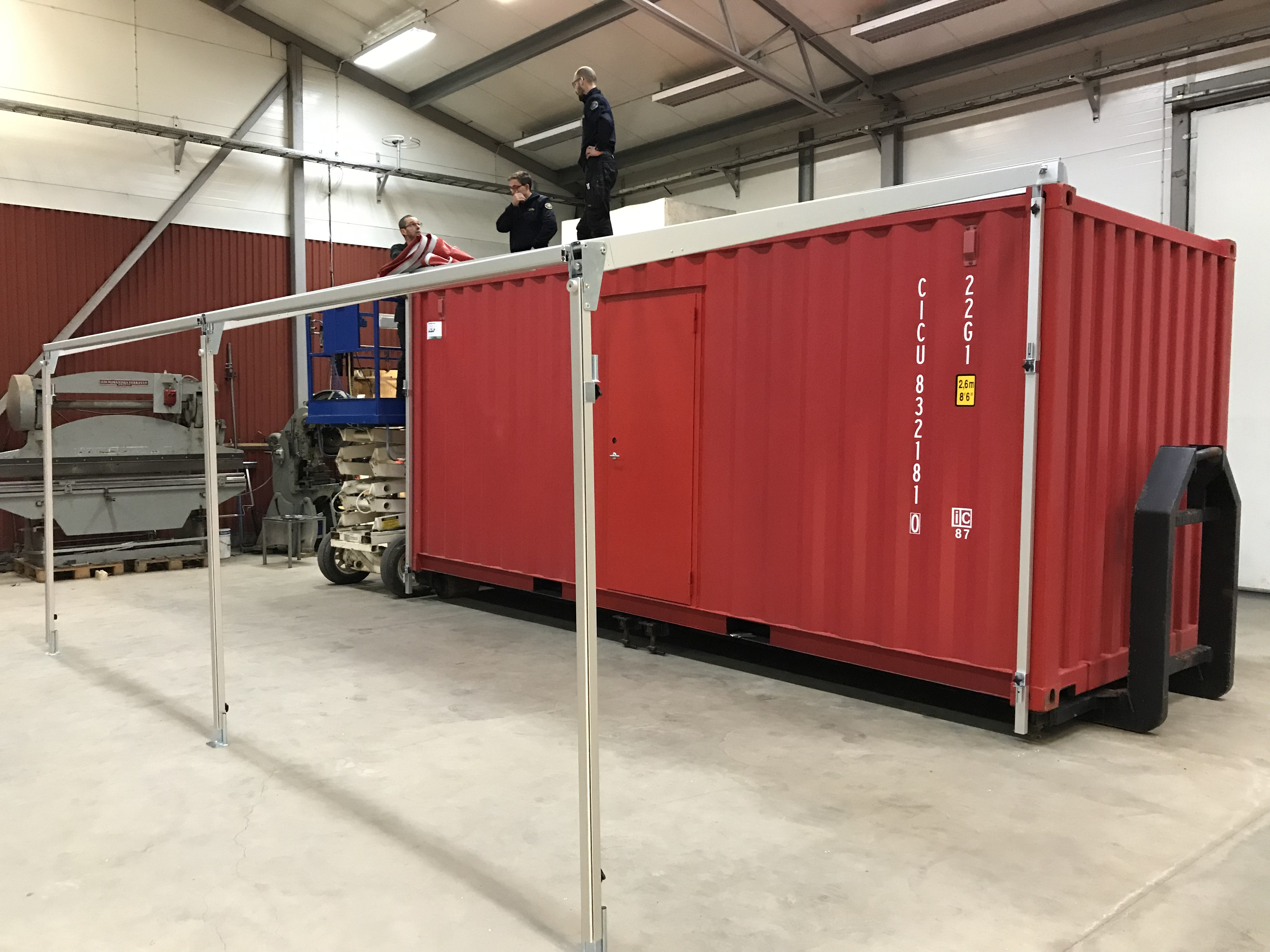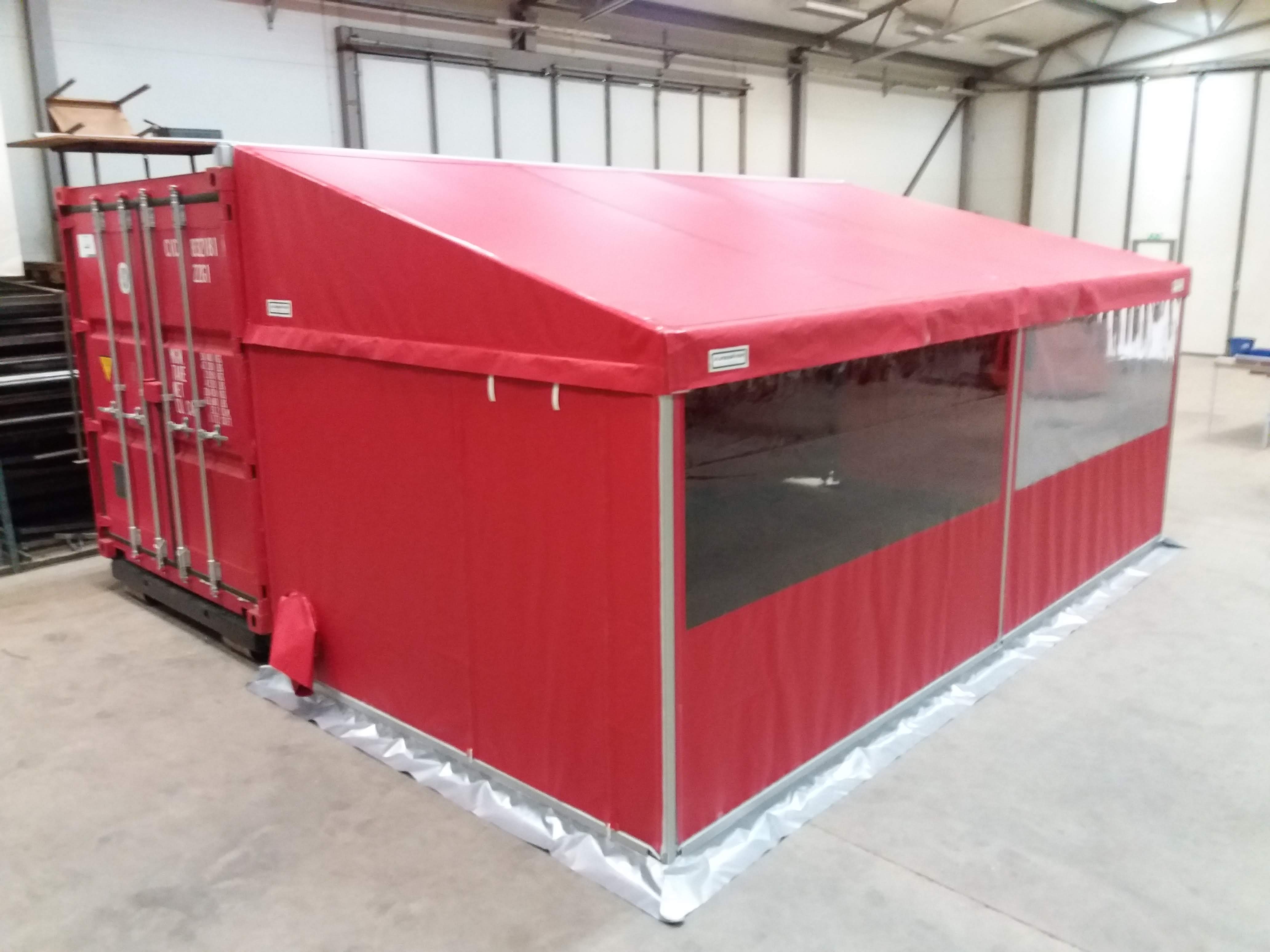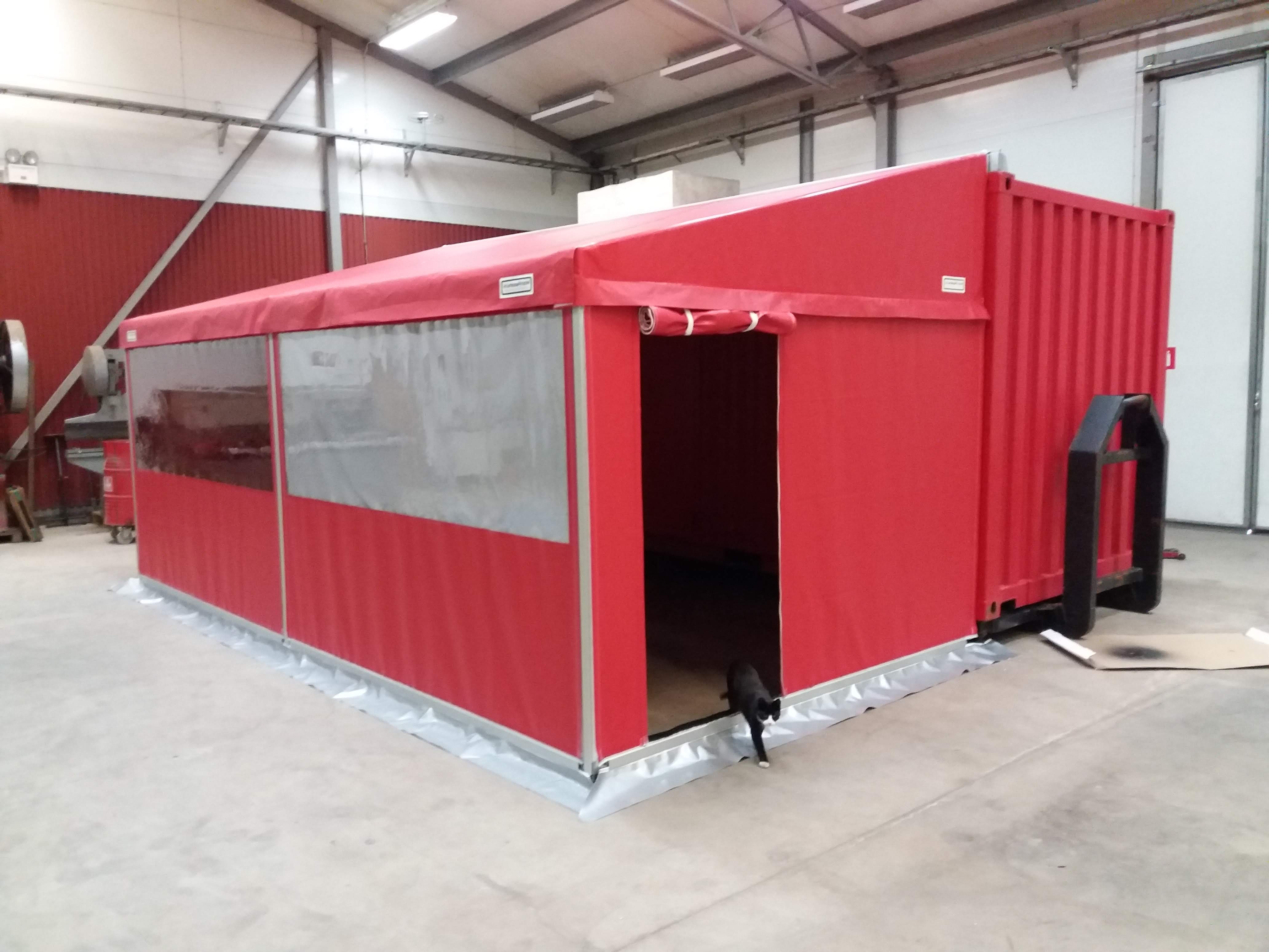 We have developed a tent for a 20ft container together with the fire brigade in Sweden. You can easy assemble the tent with 2 people. The tent can be used to store equipment, use as weather protection or as a communications center. There is an air inlet on the end where you can connect a heating fan. Everything can be easily stored in the container during movement.
