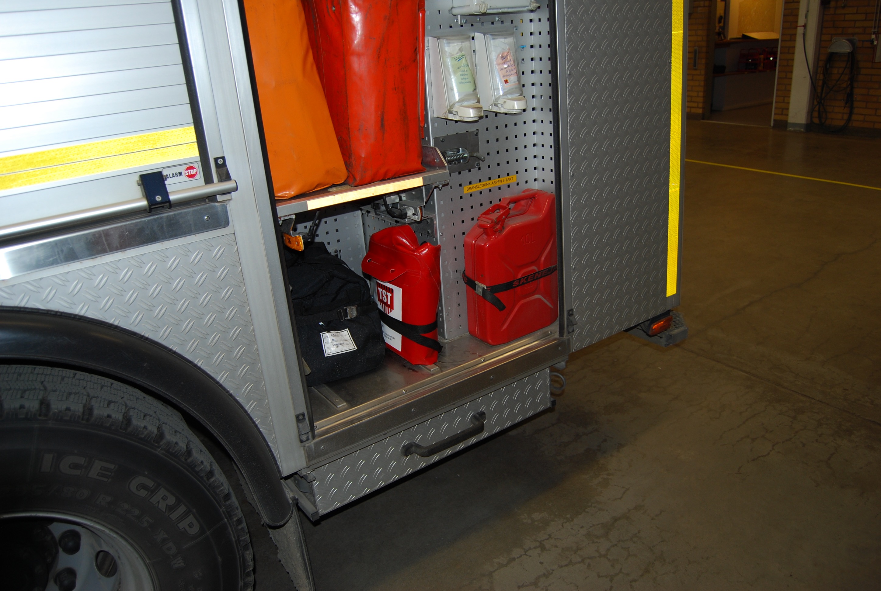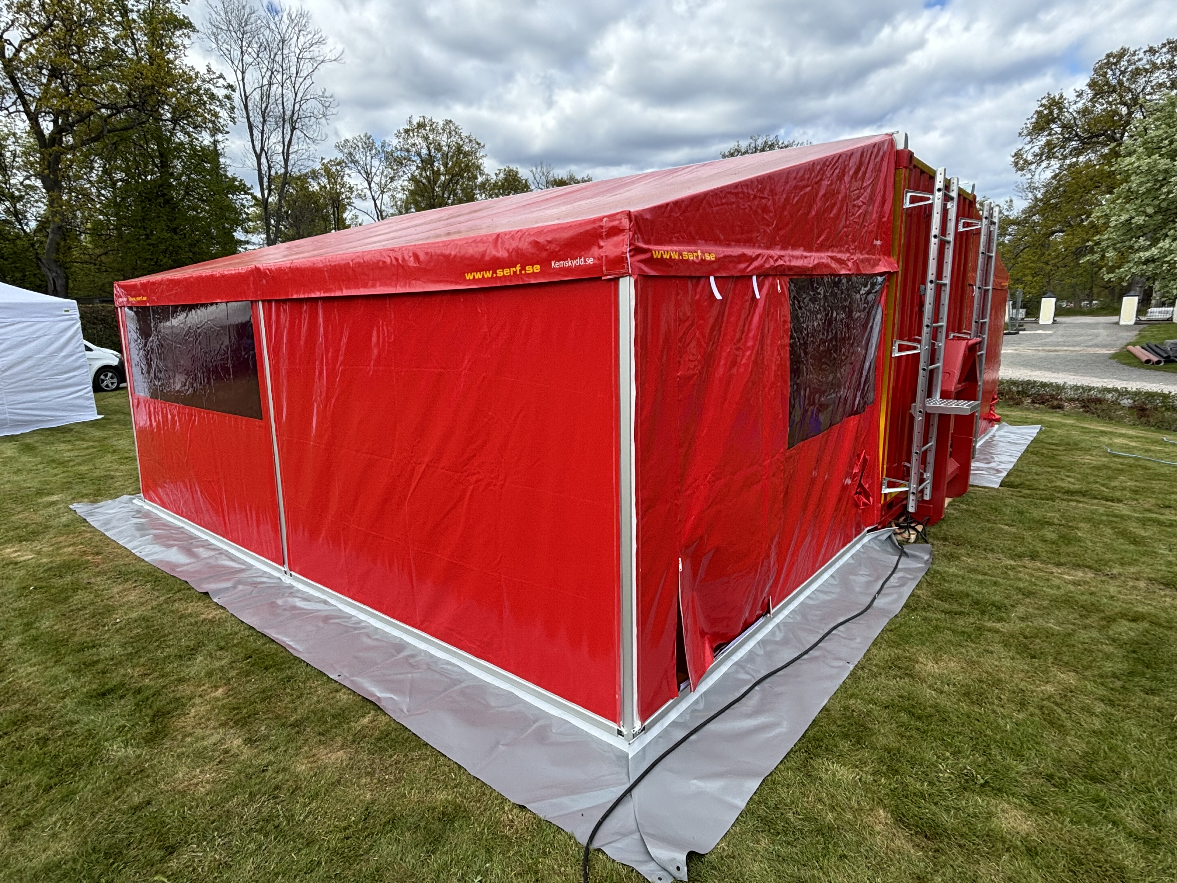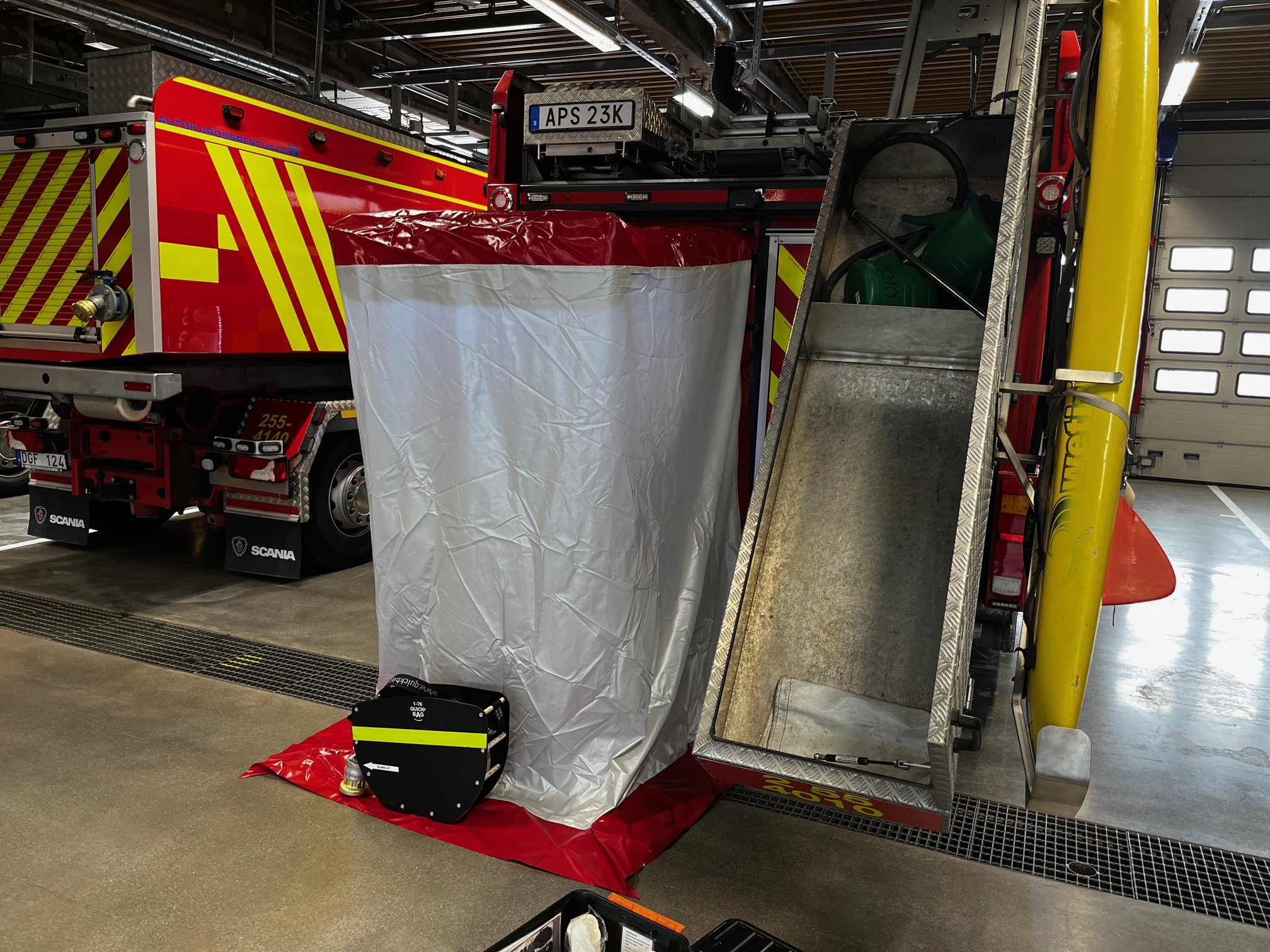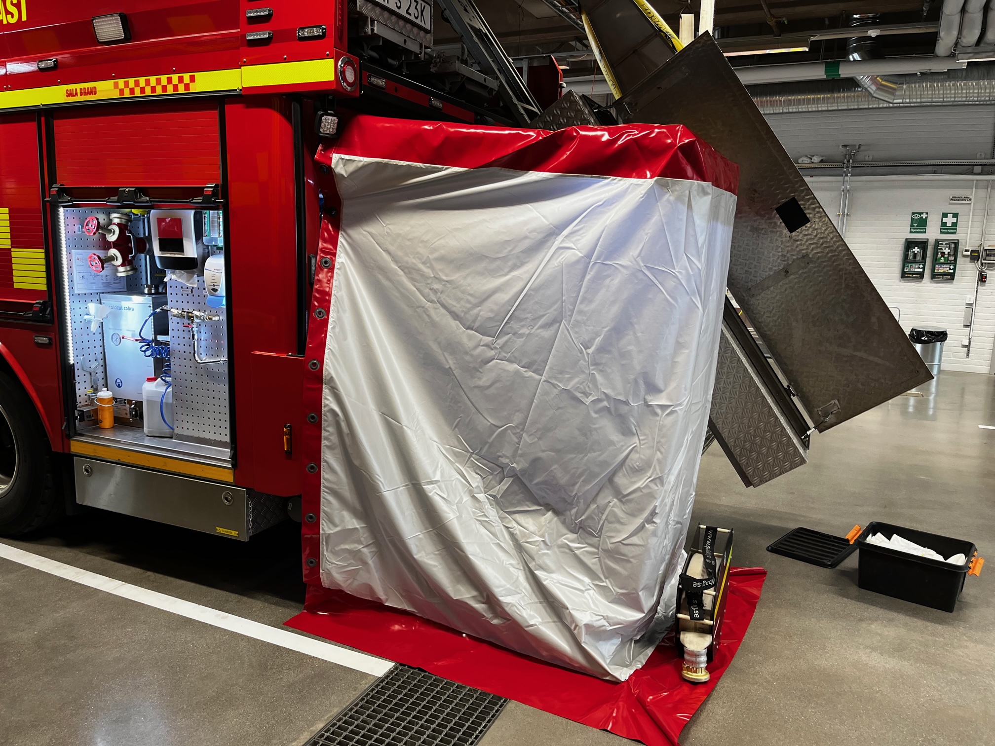 We have developed a tent for fire engines with a folding door together with the fire department. They have many female firefighters and this means that they can change in the tent without being seen. It also works as a rain and weather protection. Some fire engines also have a heat outlet in that cabinet so you can use it as a heating tent.
